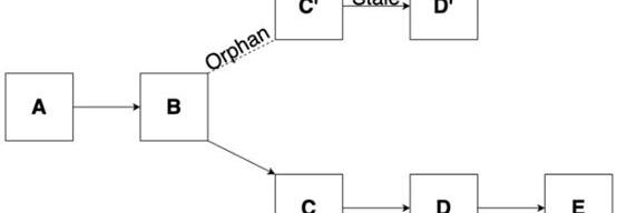 无论节点是否将B或B’作为头部,一旦区块C添加在B区块后面,B’区块就会被抛弃。B’区块的交易将放回到mempool,B'被丢弃,成为一个孤块,B'的矿工失败了,他们失去了挖矿奖励。因此,比特币的出块时间设置为10分钟。中本聪认为,10分钟是介于快速确认时间与低概率分叉的一个“中间地带”,因此孤块数量也会减少,这是一件好事。更新部分:最近我注意到,在孤块和陈腐区块之间存在很多混淆。这一节就用来阐明两者的区别。1.陈腐区块是在孤块上挖出的块。