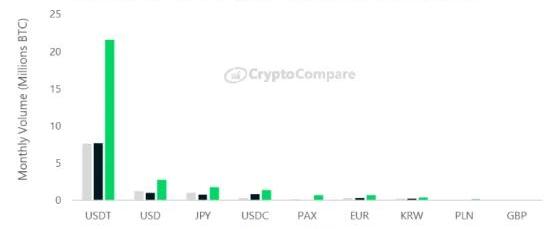 在3月份,BTC兑换USDT的交易量几乎增加了两倍,达到2160万BTC,而2月份为770万BTC。BTC兑美元和日元的交易量也分别飙升至270万BTC和180万BTC。BTC/USDT市场现在占到了总BTC交易量的73%。