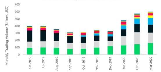 2019年12月以来,来自顶级交易所的交易量持续逐月上升。3月份,许多最大的顶级交易所的交易量平均增加了35%。尽管3月价格暴跌,但这些交易所的成交量水平仍未达到2017年12月牛市运行时的水平。总体而言,所有顶级交易所的交易量在3月份增长了8.0%,达到2880亿美元。