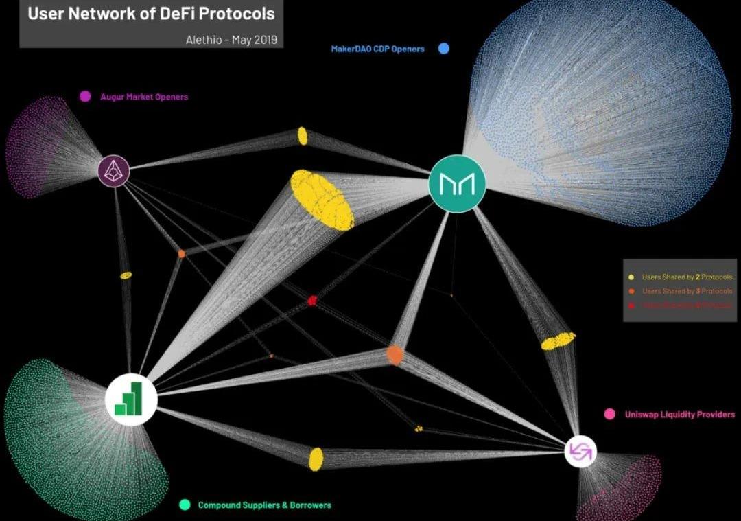 当前的DeFi协议的用户网络,如果以3D形式呈现,那么一切都将建立在MakerDAO之上,Maker变小了,因为它被分成SCD和MCD,并且DAI和Vault之间的流通速度较低以太坊是一个涌现结构