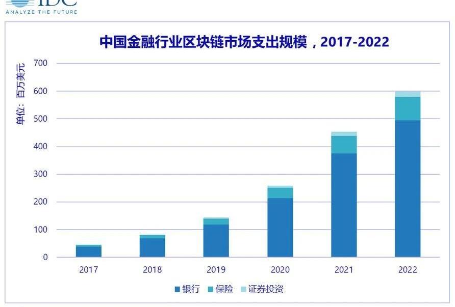 以上部分企业案例为硅谷洞察访谈调研案例欢迎更多符合上述分类的企业联系我们,加入到正式报告中据IDC最新发布的研究数据显示,近几年,在这三类主体中,目前银行类的区块链投资占比最大,占到金融行业整体区块链支出规模的80%以上。其背后的原因是,区块链的本质是一个互联网共享数据库,它应用的前提基础是行业的信息能够被数据化。而总体来看,银行整体上信息化建设比较好,也天然的具有许多如供应链金融、资产管理、跨境/跨行支付等区块链落地场景。而保险与证券业且信息化普及度不如银行,落地场景较少,因此目前仅有少数头部企业愿意投入资金进行应用探索。