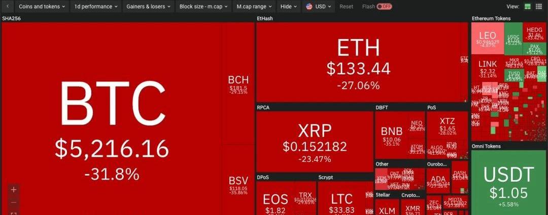 币Coin数据显示,昨日18点30分至19点短短半小时,全网总计爆仓5.65亿美元,爆仓人数19000+人;过去24小时,全网总计爆仓超过32亿美元,共有11.6万人成为爆仓受害者。过去的48小时里,我们共同见证了历史。全球金融市场遭遇多级瀑布。美股连续两日熔断,昨日更是经历了自1987年以来的最大跌幅,三大股指收跌近10%;今天早盘亚太股市全线暴跌,韩国股市触发熔断,日股重挫10%,沪指开盘跌逾4%,区块链板块开盘即跌5.41%,深证区块链50指数跌5.27%。连近期走势良好的现货黄金都被抛售,金价急跌,今日一度失守1560美元。近日被众人争辩其“避险与否”的比特币更是惨不忍睹。BitUniverse数据显示,北京时间昨日18点起,比特币短时从7300美元跌至5500美元,跌幅达到25%,晚间收于6100美元;今天上午7点,比特币再度下行,一度跌至3800美元,随后反弹至5000美元一线。截至发稿前,比特币暂报5216美元,24小时跌幅达28%,其他加密货币24小时跌幅普遍超过30%。