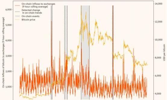 并非所有的链上流入变化都可以被定义为市场事件。链上资金流入似乎有一个自然的周期,大概是因为一方面交易者在交易所之间转移资产以实现套利,而另一方面则是为了安全性将从交易所购到的BTC转移至自己的钱包。此外,BTC一旦存入交易所并不意味着可以立即卖出,交易者要等一段时间,并且可能不得不等到许多区块链确认后才能出售。有些价格变化与算法识别的链上事件并不一致。这类消息主要改变了人们对数字货币长期前景的看法,从而导致了由需求主导的价格快速变化。尽管这一消息引发了链上反应,资金流入在消息宣布后有所增加,但可能有些人会急于以更高的新价格卖出。但这似乎并未对链上资金流入产生重大影响,而这种影响通常似乎只与市场的短期变化有关。重现市场事件
