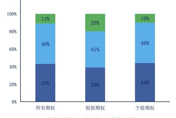 期权市场是一个机构主导的市场,以美国期权市场为例,参与者主要有:交易所、期权清算公司、期权做市商易商、机构投资者、个人投资者及市场监管机构。机构投资者为主,约占市场的57%,个人投资者占43%。其中交易量最大的是做市商,占比46%,做市商为整个市场提供了很好的流动性。分类来看,股指期权市场中,机构投资者相对更多,占比20%;而个股期权市场中,人投资者占比相对有所上升,占比44%。