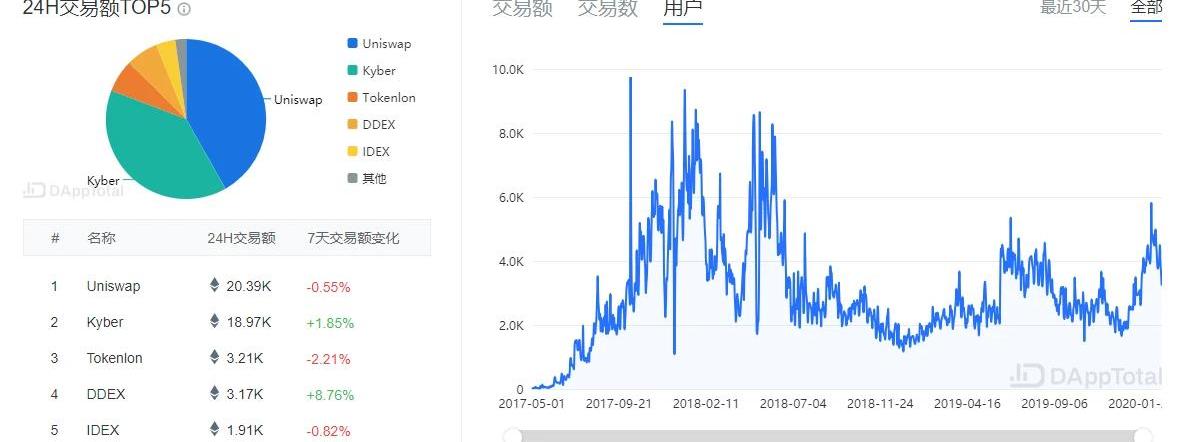 来源:Alexa据Alexa数据统计,本周币安网站UV为105.6万/天,与上周环比上涨17%;同时PV为612.4万/天,与上周环比上涨18%。币安作为加密世界的头部交易所,占据市场绝大部分流量,说明最近市场整体流量有所增加。去中心化交易所DEX用户数统计
