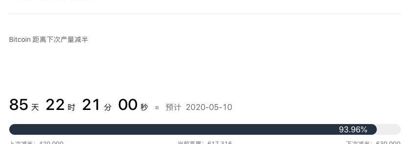 数据来源:标准共识、CoinMarketCap根据标准共识减半倒计时指数显示,BTC目前区块高度为617,316,距离下次减半仅剩有85天。BTC实现减半利好预期还需要一定时间,但投资者需关注BTC减半时间,下次减半已经临近,BTC价格目前逐渐恢复到$10,000。