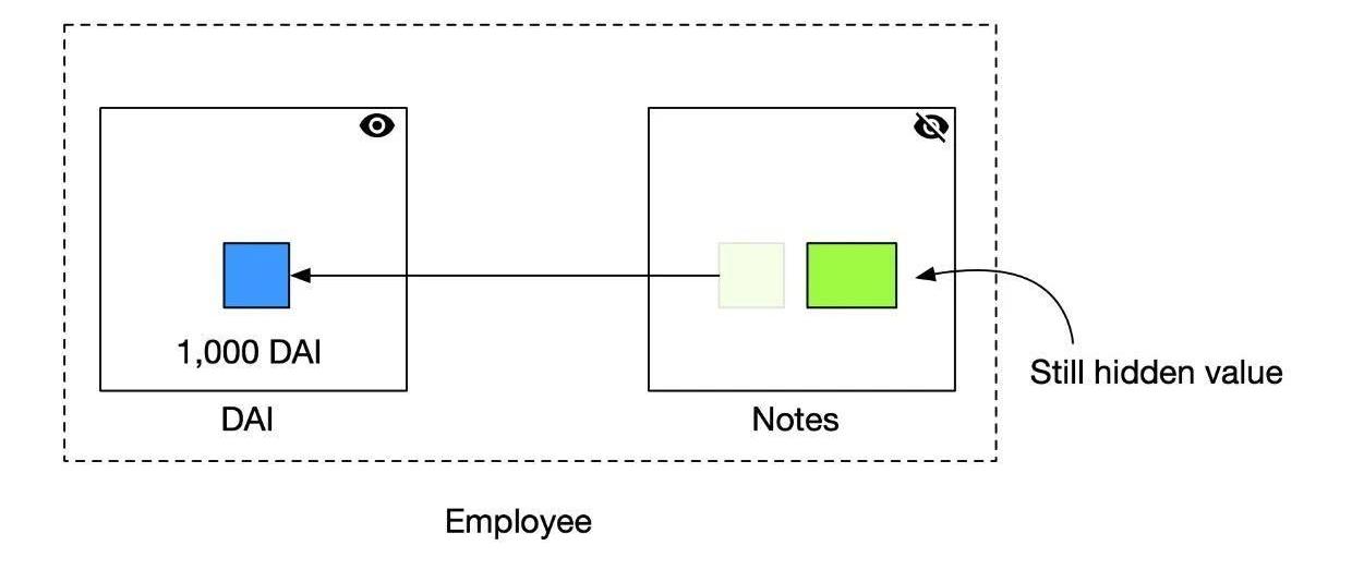 员工收到代表10,000DAI的票据后,当需要用钱时可以将此票据中一部分的DAI如1,000DAI从隐藏价值的note切分出来,一部分变成公开的DAI,另外一部分仍是隐藏价值的note,此时区块链上可以知道此员工换出了1,000DAI,但是不知道他还剩下多少DAI,此员工也可以一直重复这个步骤把钱领出。
