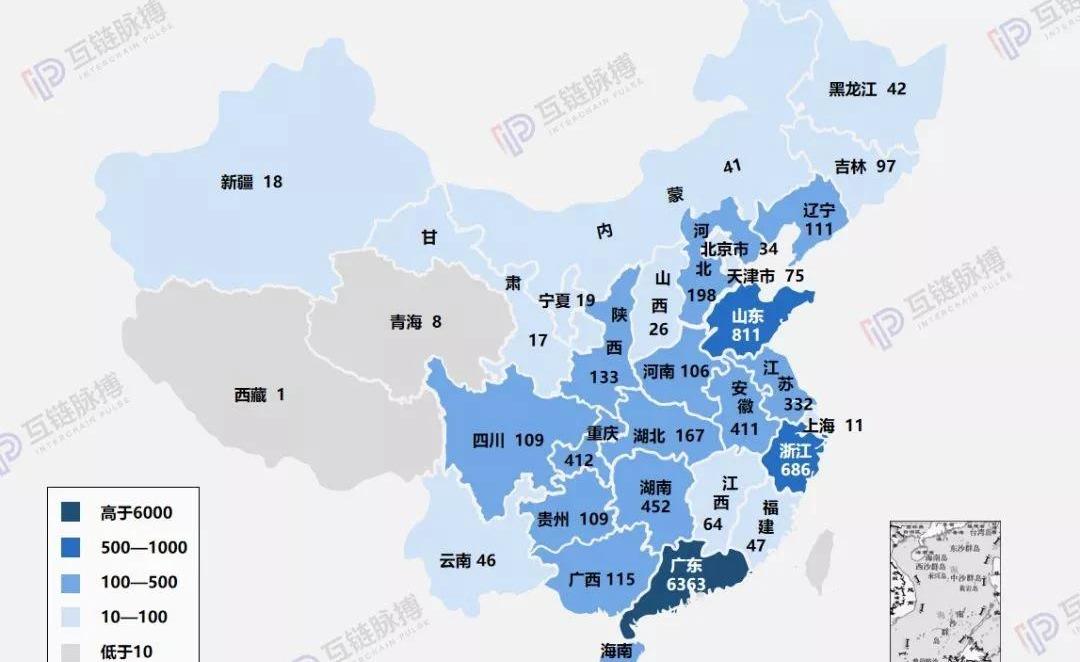 同时,2019年全年成立的区块链企业数,较2018年全年成立的区块链企业数,也有下降,降低了21.9%。由此可见,在经历2018年的“迅猛扩张”后,2019年区块链企业的发展已趋于冷静,恰印合了Gartner曲线。但或是由于“1024会议”的助推,国内的区块链市场并非一下扎入“泡沫化的低谷期”,2019年区块链企业的成立数量仍旧维持在万计的量级上。且若将时间线拉长,相较于十年前,2019年区块链企业的成立数量已增长180余倍。此外,互链脉搏关注到,对2019年区块链企业成立数贡献最多的是广东省。今年,广东省共有6363家区块链企业成立,占到总成立数的56.82%。而处于第二梯队的是山东省和浙江省,2019年分别有811家、686家区块链企业成立。位列第三梯队的是湖南省、安徽省、重庆市等中国中部地区。2019年区块链企业成立数量热度图