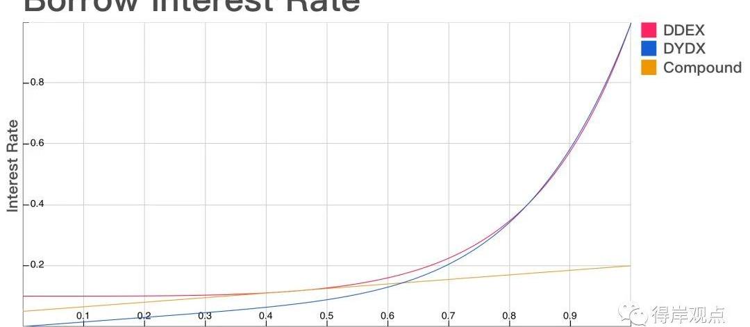 Compound、dYdX等借贷池类的平台,其存贷利率是由供需关系直接决定的。利率是借贷池中资金利用率的函数:当资金池中大量资金被借出,资金利用率上升时,利率就会相应上升,以此抑制贷款需求,同时吸引用户存款补充资金池;相反当资金利用率降低,为了拉动需求激励用户贷款,利率也会相应降低。利率调节的过程是由算法自动完成的,尽管有一些参数可以人为修改,我们仍然可以认为,这些平台的利率是由算法决定,利率曲线的形状十分固定,而不容易进行人为干预。
