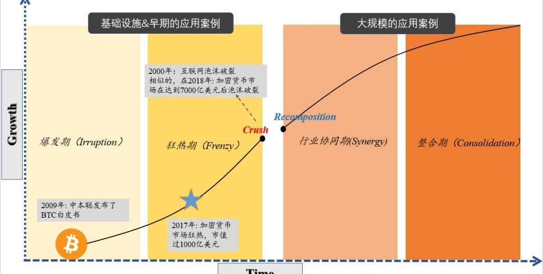 1.加密时代——去“数据寡头”时代的到来当我们回顾过去数十年信息技术市场的发展,可以看到每一次大的市场周期都遵循着相同的规律不断地发展,即:去中心化,扩张,整合的循环周期。在移动互联网时代之后,下一个时代的风口叫做加密时代——去“数据寡头”的时代,这也是一个数据开源和信息民主化的时代。2009年,SatoshiNakamoto创造的BTC标志着这个时代悄然到来。在这个时代,用户的数据将不再由商业寡头们垄断,用户数据隐私、安全性将比现在更能得到保障。因为数据的托管方式将是去中心化的,且抗审查、防止篡改的,用户对个人数据拥有控制权。在Web2.0时代,用户数据是支离破碎的存储在各个中心化的公司的。举个例子就是:用户经常使用的网易云音乐、虾米音乐、Spotify等平台是无法共享用户的歌单数据的,并且产品之间的恶性竞争最终需要让用户来进行买单。当虾米音乐被收购的那一刻,许多用户只能通过笨拙的方式一条条导出歌单列表。以产品为中心的互联网服务在Web2.0并不会过多的关注用户数据体验的重要性,这些平台都在构建各自的护城河及竞争性服务,比如Google、Facebook表面给用户提供免费的服务,但实际上通过对用户的数据和行为习惯进行分析后推送广告增加商业流量,变相地侵犯了用户的隐私。然而,在Web3.0时代,传统互联网以产品为中心的格局将不复存在,用户数据通过区块链平台改造后,使用权和管理权都将归属将于用户本身。这意味着用户能够真正自己决定数据怎么用,比如用户可以自己授权某个机构或者公司使用自己的数据,但同时被授权方依赖数据创造的价值必须分配给相当一部分给数据的主人。在Web2.0时代,如果你在中国用百度和淘宝,这两个公司一定会有你的以下信息:个人的搜索偏好记录、对你在网上的各种行为分析的数据等等。然后他们其实都建立了关于你这个人的认知文档,但是你作为数据真正的主人却拿不到应属于你的数据画像,而如果淘宝或百度变成一个区块链世界的公司,那么它在有你画像的同时你自己也有,这意味着你对自己的数据既有管理权也有使用权。2.用技术经济范式转换理论看加密时代的来临图表5:加密网络的时间发展线
