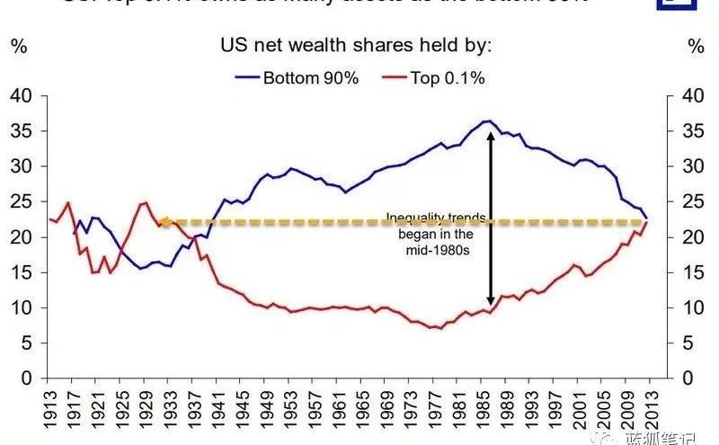 在现代货币经济学体系下,美元是基于信贷系统运行的,它通过不定期的量化宽松政策刺激经济的发展,但这里的问题又回到了哈耶克的洞察,美联储作为货币政策的决策机构,它能够掌握所有的知识吗?它能够理解人们的所有行为吗?它能够做出完美的决策吗?它的决策会带来不可预测的后果吗?从目前来看,这种货币政策虽然推动了经济的发展,但每隔一段时间就会带来经济危机,当人们收入的增长支撑不起其债务时,经济危机就会爆发。为什么中心机构无法实现资源的最佳配置?很重要的原因是其无法掌握所有的社会知识。任何中心机构都存在知识瓶颈,无法在单个时间点作出所有的最佳决策。这是任何个人或单个机构的局限。在这个复杂的系统里,因为无法获得所有的知识,因此无法计算出绝对肯定的因果关系。哈耶克曾说:“如果我们拥有所有的相关信息,如果我们可以从一个已知的偏好系统开始,如果我们掌握了完备的知识,剩下的就只是逻辑的问题。也就是说.....解决这个优化问题的必须满足的条件已经被计算出来,而且可以用数学形式进行最好的表达。”哈耶克说得很清楚,人们只要拥有完备的知识,答案就自然而然地出来了。中本聪也曾经表示,事实上确定合适的通胀率是不可能的。如果无法衡量,就无法管理。没有足够完备的知识,就无法为经济提供足够合适的政策。中本聪的想法跟哈耶克类似,既然是不可能,那么为什么不去掉单个机构的人为干预呢?当前美元由信贷体系驱动,通过量化宽松不断刺激经济增长,但这种持续通胀的模式不仅可能会产生经济危机,而且还导致财富分配发生变化。而这个变化,对于普通人来说,处于不利的位置。从下图看,美国0.1%最富有的人和底层90%的人之间的财富相比,在1985-1989年间底层90%的人占据明显的优势,但自那之后,0.1%最富有的人占据的财富总量持续快速上升,而底层90%的人财富总量持续下降,到来2013年,两者财富总量持平。