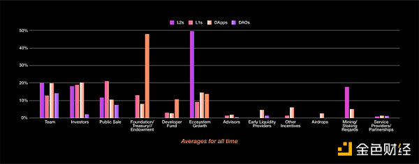 L1 和 L2 倾向于将它们的代币供应的最大部分奉献给早期利益相关者和他们的公开销售。