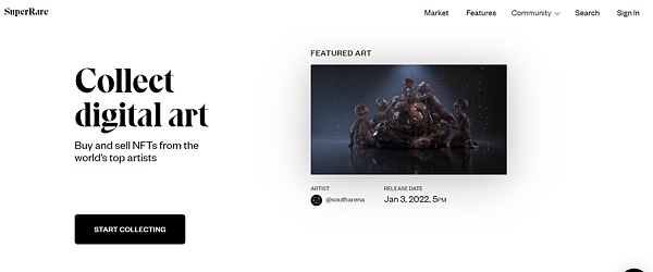 SuperRare(RARE)是一家老牌NFT综合交易平台,创建于2018年,同样是建立在以太坊上。相较OpenSea的「人人都可创建NFT」,SuperRare对NFT作品质量要求更高,它为创作者设置了一些门槛,比如,艺术家首先要向平台提出申请,SuperRare每周进行严厉审查,审查通过后才能上架。