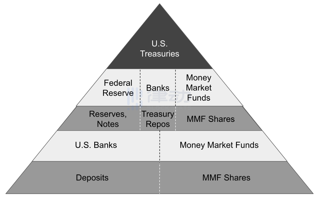 Bhatia 的精彩著作非常优雅地概述了货币的层次结构: 金字塔顶端是黄金和美国国债。他进一步指出,bitcoin(有意被设计为黄金) 可以取代黄金的地位,或者,如果美国财政部处于这个金字塔的顶端,银行将能够发行由 bitcoin 本身支持的新形式的货币。