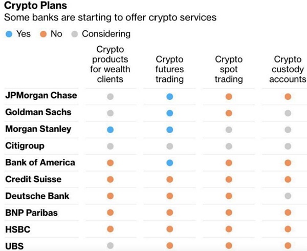 摩根大通已经在为 Coinbase、Gemini 等美国持牌交易所提供银行服务。摩根大通的联席总裁 Daniel Pinto 最近表示,该机构最终将不得不推出比特币服务。