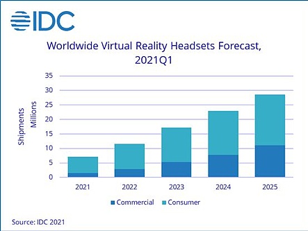 据IDC数据显示,全球VR设备出货量正在提速,预计2021-2025年全球VR头显出货量将保持41%的年复合增速。预计2021年的出货量将由2020年的670万台提升到850万台,2025年更是将达到2860万台。