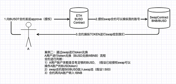 案例二:通过swap进行token兑换 A用户进行token兑换(BUSD兑换WBNB)流程 合约进行判断: