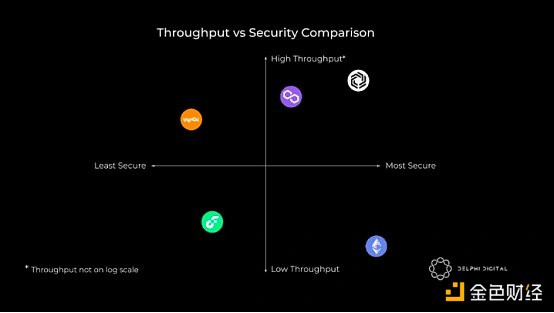 EOS链,WAX的L1,TPS历史最高值为4000,在吞吐量方面排名第三。但是,其可扩展性的权衡程度就明显不同——因为整个区块网络只有21个验证节点。所以,我们团队(以及别人)认为,EOS的去中心化程度很低,其安全性排在最后一位。最后,Flow的吞吐量约为100TPS,如果以主流采用作为标准,这一水平还远远不够,但是如果是作为一个真正的去中心化网络来说的话,这个数字已经很高了。但是事实却是Flow虽然有140个共识验证节点,但是绝大部分都是Flow团队自己直接运行的,而且,需要得到许可才能运行节点,所以不难看出Flow的形式也是高度集中化的,所以在安全性方面,我们只认为它略高于WAX。不过,我们相信在未来,Flow比EOS更容易去中心化,因为我们认为,Dapper Labs(Flow背后的公司)相比于EOS,更不太可能用户。