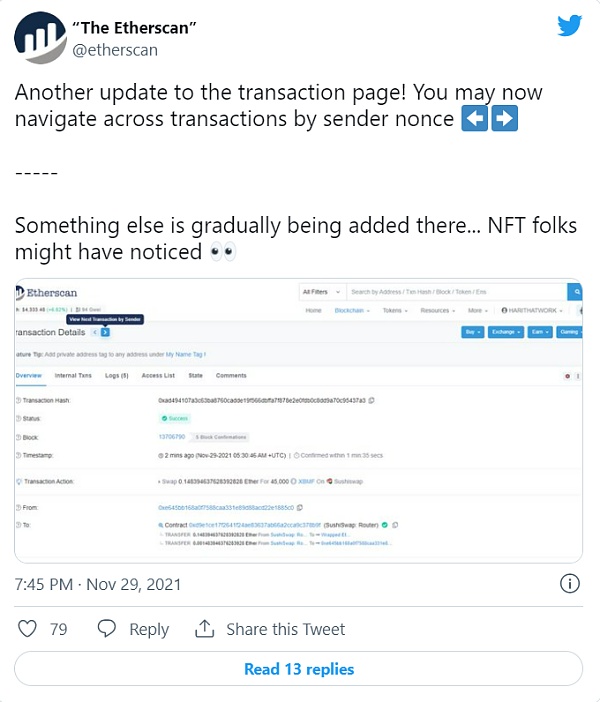 11月,交易详情页进行了一次很棒的升级:用户可基于发送者随机数 (或交易单号) 导航交易。这个功能帮助用户更好地循环浏览交易。?