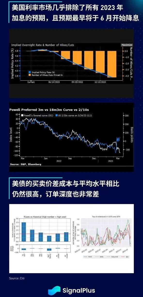 -美国利率市场几乎排除了所有2023年加息的预期,且预期最早将于6月开始降息,5月FOMC加息的可能性已经降至仅24%,且预计到12月将有90个基点的累计降息;银行业持续面临压力、缺乏量化宽松政策或扩张资产负债表的承诺,加上存款外逃预计将导致信贷条件收紧,都让市场相信当前利率已经过高,使经济难以维持。美债收益率继续走低,2年期接近3.75%,10年期接近3.37%,1y1y接近2.80%,而Powell青睐的18m3m“衰退曲线”倒挂情况令人不安,不过2/10s曲线则相反地走陡;二级市场流动性依然严峻,美债买卖价差约为正常水平的2倍,股票和固定收益的订单深度都非常差