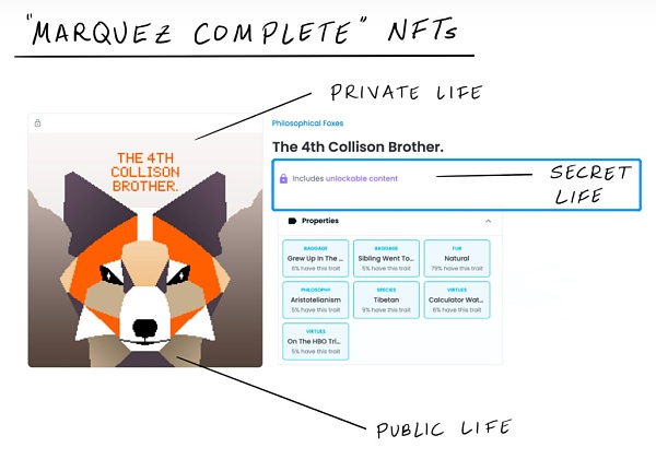也有一些NFT头像在铸造之初就已经具备了一些较为鲜明的特点,比如前文提到的加密女巫Crypto Coven系列NFT,天然与性别议题相关;还有Philosophical Foxes系列,每只小狐狸都有独一无二的形象,独一无二的个性、哲学思考,甚至秘密。这些也许能够带来叙事的火花,帮助我们把静态的图像变成一个个故事,并随着时间的推移而获得更大的叙事权重。