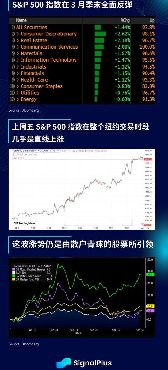 -公开市场的股票投资者在季末购买情绪高涨,S&P500指数在上周五几乎直线上涨1.4%,94%的成分股都呈现涨势,在季末的再平衡之前没有出现任何明确的回调;由于专业基金经理人在今年开局不佳后有所减持,当前的涨势仍是由散户青睐的股票所引领。