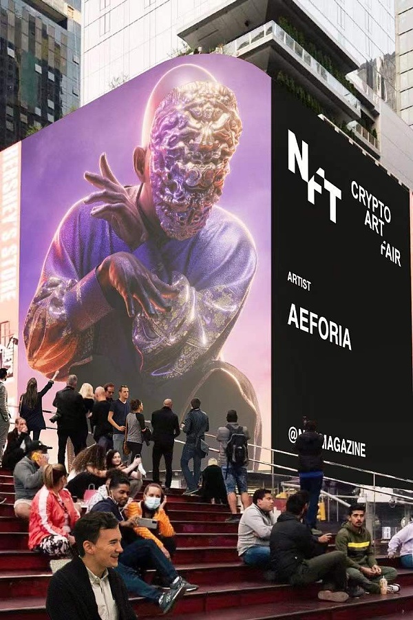 2021年11月2日,纽约时代广场的广告牌上,正在进行加密艺术博览会,展出超过70位艺术家作品。