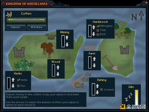 《Managing Miscellania》是《Runescape》中的一个迷你游戏。玩家可以在保险箱中存入最多5 - 750万金币(取决于任务完成情况)。每天都有多达5 - 7.5万美元的资金被拿出来,用于支付给获取资源的“工人”,这些资源随后会被玩家收回。奖励往往是有利可图的,但资源是被广泛需要和消耗的技能。玩家将金币存入金库,因为他们渴望获得成就、提升技能。