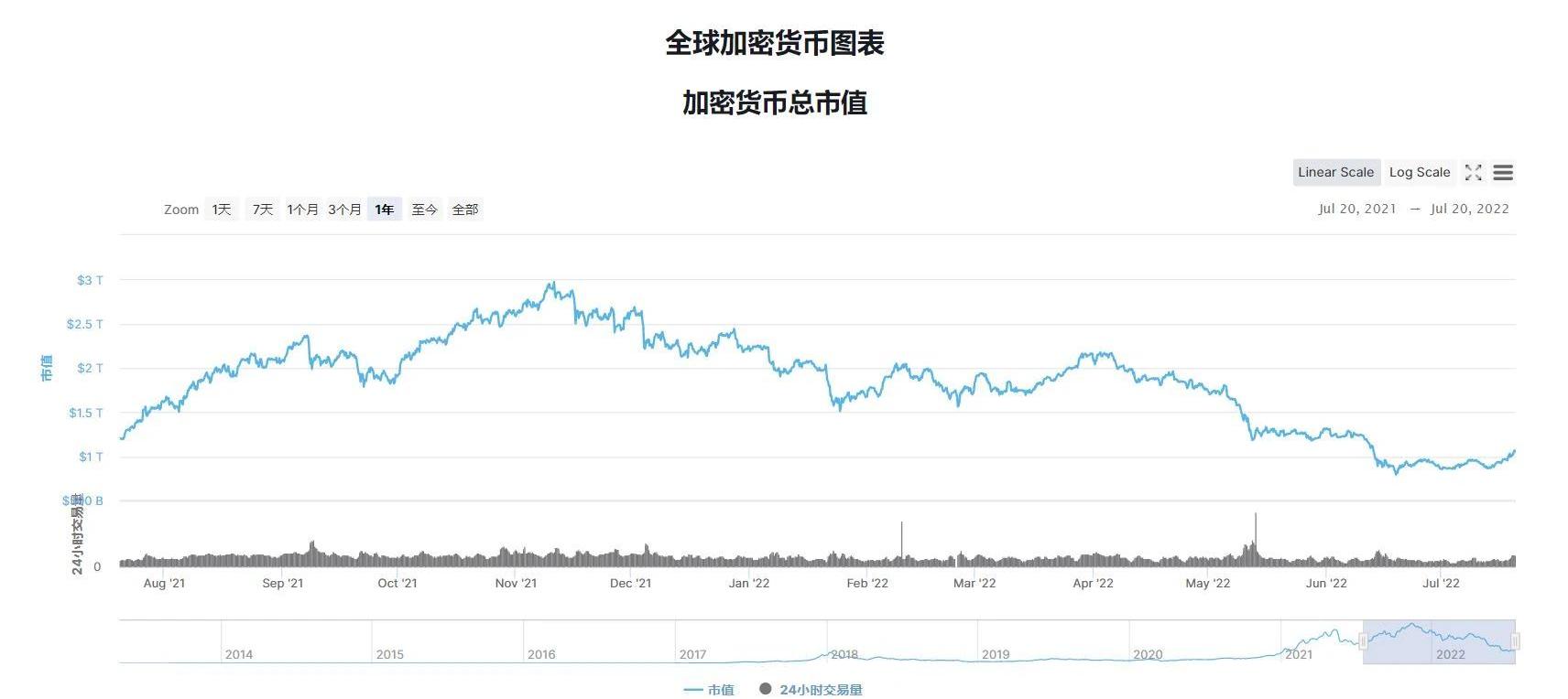 BTC的下跌也带动加密资产整体市值的骤降:据CoinMarketCap数据显示,2021年11月11日,加密货币总市值创历史新高,为29,715亿美元,而今年的6月19日,加密货币总市值相较于历史高位下跌了72.3%,为8,229亿美元,7个月时间,市值蒸发了21486亿美元。有分析称,2022年是数字资产历史上破坏性最大的熊市。