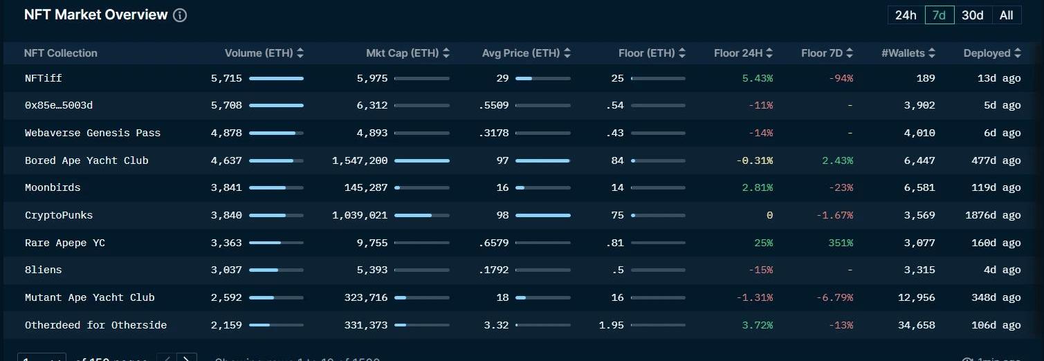NFT市场活跃度依旧较低,短期值得关注的项目,一个是NFTiff,由Tiffany&Co公司发行的250个艺术品NFT,在本周出现较高交易量增长。另一个是10KTF发行的Battle.town,10KTF是之前发行以无聊猿为主元素的潮鞋发行商,其可以支持将一部分蓝筹NFT项目做为模板,发行对应的子潮品,本次发行的Battle.town是基于游戏元宇宙背景下,一套以战斗装备为基础的盲盒NFT,近期交易较为活跃。