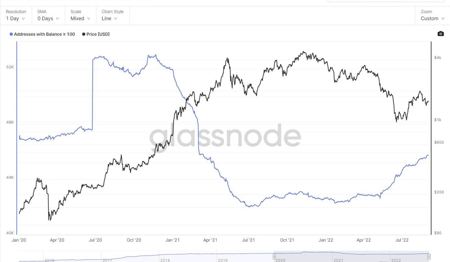 ETH持币地址数:整体地址数均稳步上升,持币100以下地址区域进场快速。