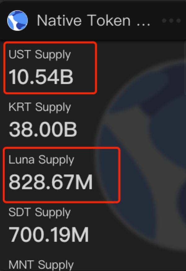 首先我们先来看看Terra本身是什么情况。如果把Terra当成美联储,那么UST就是美元,而LUNA就承担了部分储备黄金的作用(当然LUNA和黄金还是有区别的。这里只是说作为价值储备的作用是相似的。不过别忘了,Luna本身的价值反过来也是由UST的效用所支撑)。所以,我们首先应该看下二者目前的供应量是怎么样。根据Terra dashboard提供的信息,最新的数据如下: