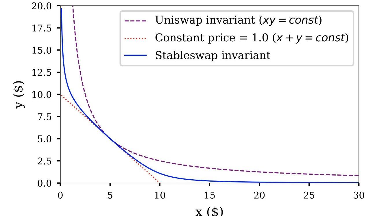 StableSwap模型的曲线兼具恒定和与恒定积的特点,在各稳定币相对平衡的情况下,公式由恒定和占主导,曲线趋于直线,滑点较低;当在极端情况下,各稳定币不平衡,则公式由恒定积占主导,曲线与坐标轴无交点,不会出现流动性枯竭的情况