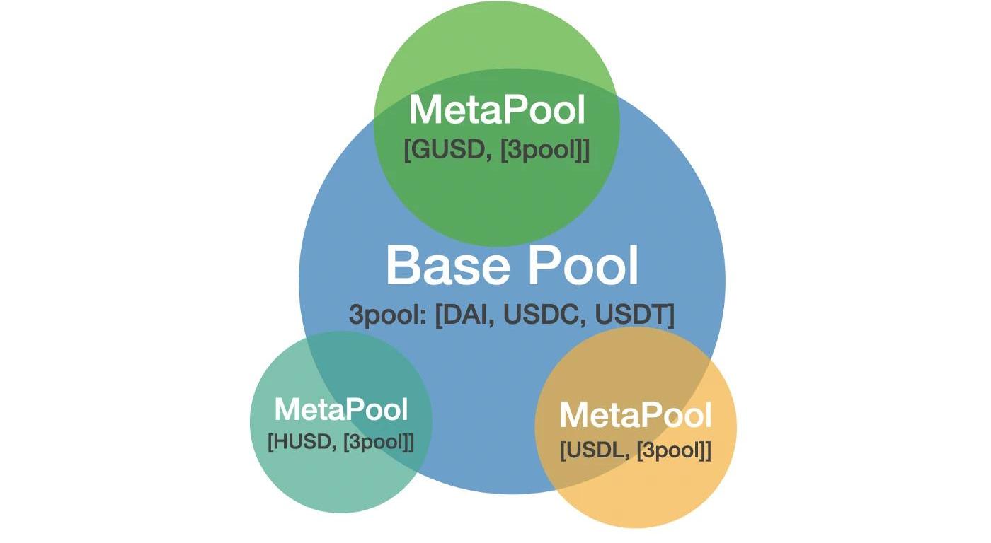 metapool为basepool基础上扩展衍生的新池,用作将新型的稳定币向basepool的LP代币锚定。basepool池的流动性提供者可以将basepool的LP代币再次在metapool中添加流动性,进一步赚取额外的交易手续费收益。