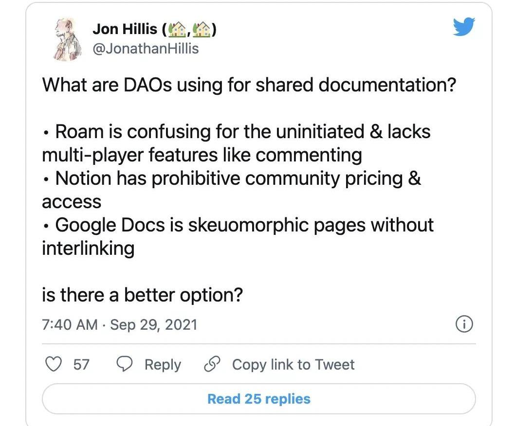 文档和团队知识管理工具是DAO的一大痛点。目前还没有可行的基于web3原生的解决方案,所以我们只能使用常见的web2技术工具:Notion、GoogleDocs和Roam。