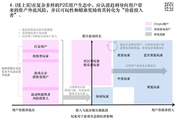 4- 认清趋利型用户画像并尝试进行教育与转化:应改变传统玩家分类思路,正视P2E游戏领域充斥着ROI驱动型玩家的现象,并充分认清用户惯性造成的资金外流风险,通过社群/身份认同/可玩性等需求的满足引导其成为生态价值贡献者。