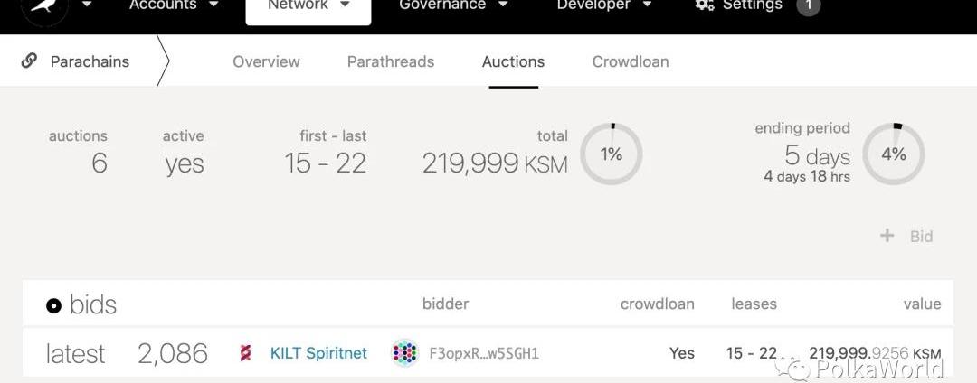 随机结束期中,每个区块出价最高的项目都会显示在PolkadotJS中的Auction页面。