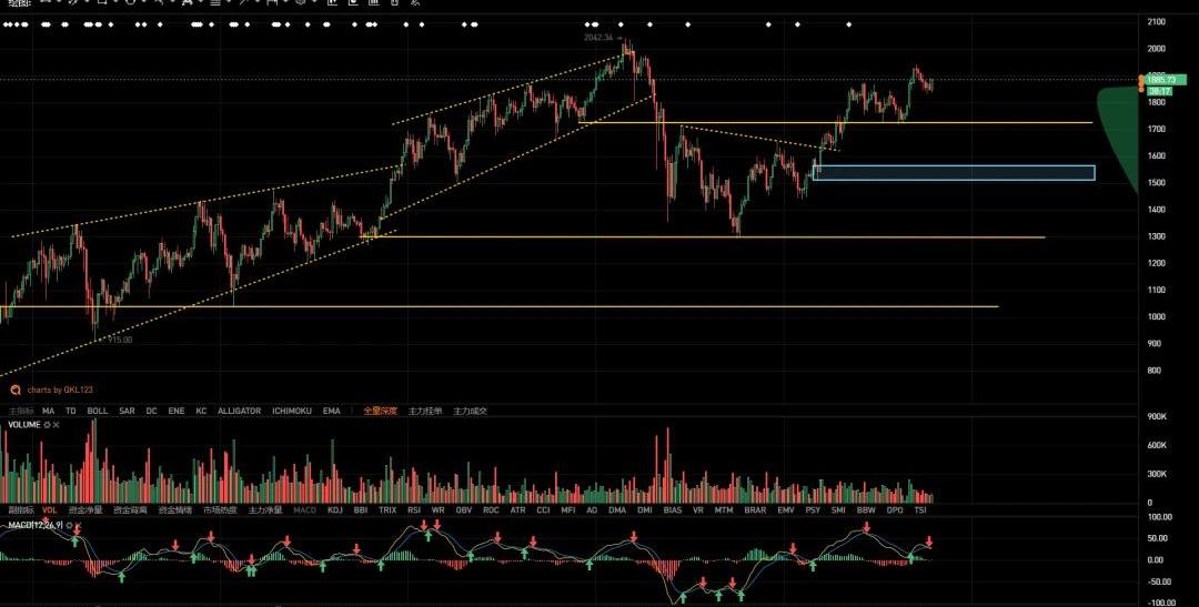 继前期报告所述,后续关注比特币资金动向及自身短期支撑1725附近,该位置构成一定下跌阻力,若得到有效支撑则看向前高。如图所示,自上期报告至今,以太坊刚好于1725附近得到有效支撑并跟随比特币上扬逼近前高。当前距离前高仍有超100美金空间,可关注ETH/BTC汇率情况,当前报价0.031220,若突破汇率低位震荡区上沿0.032附近,且大盘维持多头格局,则有可能进一步突破前高,但同时需要提防大盘回补缺口带来的盘面短期下跌风险。