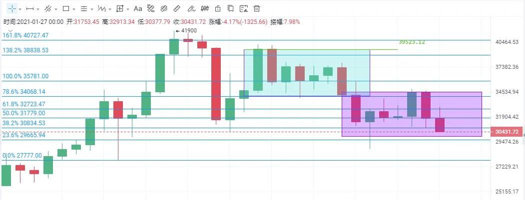 日线图看:从1/21号开始,行情基本就一直处于35000美金-30000美金区间的一个震荡调整,到今天为止,已经持续一周的时间,这样的震荡修复自从上了20000美金后很少遇见的。也就是因为这种持续性的震荡,让不少手中持有主流现货的朋友出现了恐慌,甚至有些在“山顶”进场的朋友直接在这个区间损掉出局!这些抛货出局的朋友可能还不明白,这正是狗庄想看到的,用回调和长时间的震荡修复,再加上市场的一些不利好的消息面来想法设法的去磨灭市场上的那些自认为牛市已经结束的韭菜,然后再以低价接盘!我只想问大家,既然已经购买进场,为什么不能熬过这个修复时期?难道等再次新高的时候,你却再次想咬着牙在高位接盘?