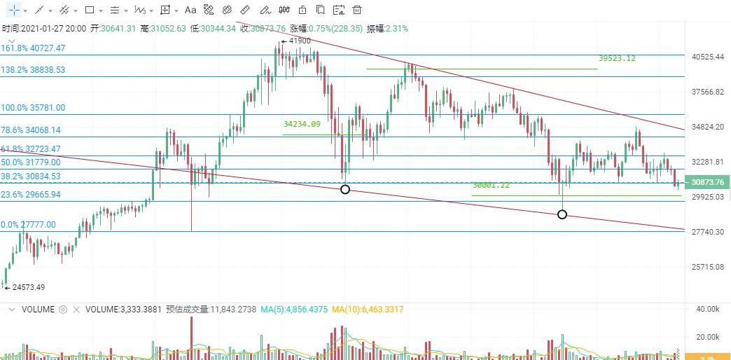 从图上可以看到,当前级别是4小时级别,BTC处于下跌楔形整理中。上沿阻力位在34800,下沿支撑位在28200。BTC如强势上破34900,则有机会去冲击38000。BTC如下破30210低点,大概率会去到29500附近。上方压力3295034900;下方支撑3021031000