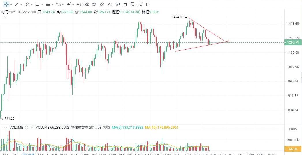 从图上可以看到,当前级别是4小时级别,ETH处于三角整理中。上沿阻力位在1362,下沿支撑位在1240。目前ETH接近三角末端,这里可耐心等待ETH选择方向后再操作。如EHT突破三角,大概率会去1380-1430。如ETH下破三角,大概率会去1200-1140。上方压力13781450;下方支撑12401197