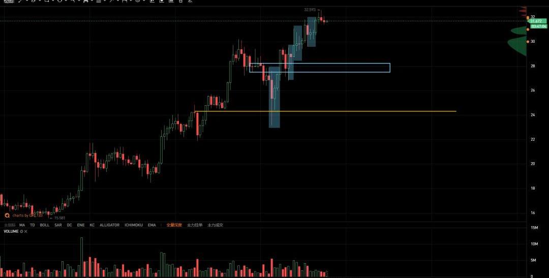 如图所示,波卡4H级别上涨过程中形成多个孕线结构,均超过一倍的子线空间,后市可重点关注孕线结构策略参与趋势交易,出现回踩或整理注意辨别符合趋势的孕线结构信号。