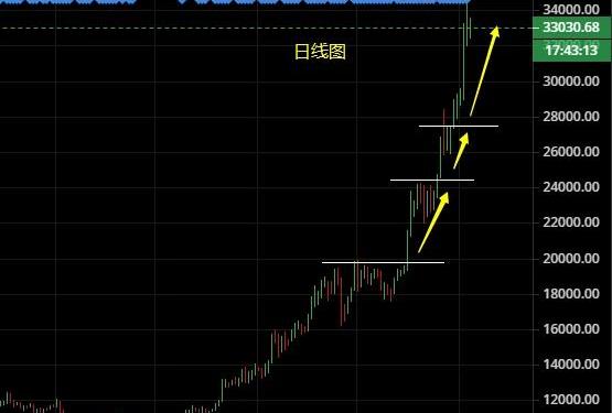 比特币隔日再度强势刷新新高,在价格突破30000大关后多头一发不可收拾,上方最高触及34786一线,这个位置对于很多朋友而言的确太突然,我们可能猜到今年价格会有进一步的上升表现,但意外的是仅仅只用两个交易日就抬升了几千点;在如此强势的行情走势下,也直接点燃了投资者的热情,这是好事,但是在此我还是想奉劝大家一定要理智,不要一味的去跟风盲目的去操作,牛市也不是每个人都能赚钱,合理控制风险,认真分析走势,谨慎交易每一笔单子,才能真正的存活在这个市场,我一直认为市场永远是公平的,犯了错第一时间应该去反省自己的问题,因为你控制不了市场,但是可以控制自己,一意孤行一错再错,下一个被淘汰的就是你。