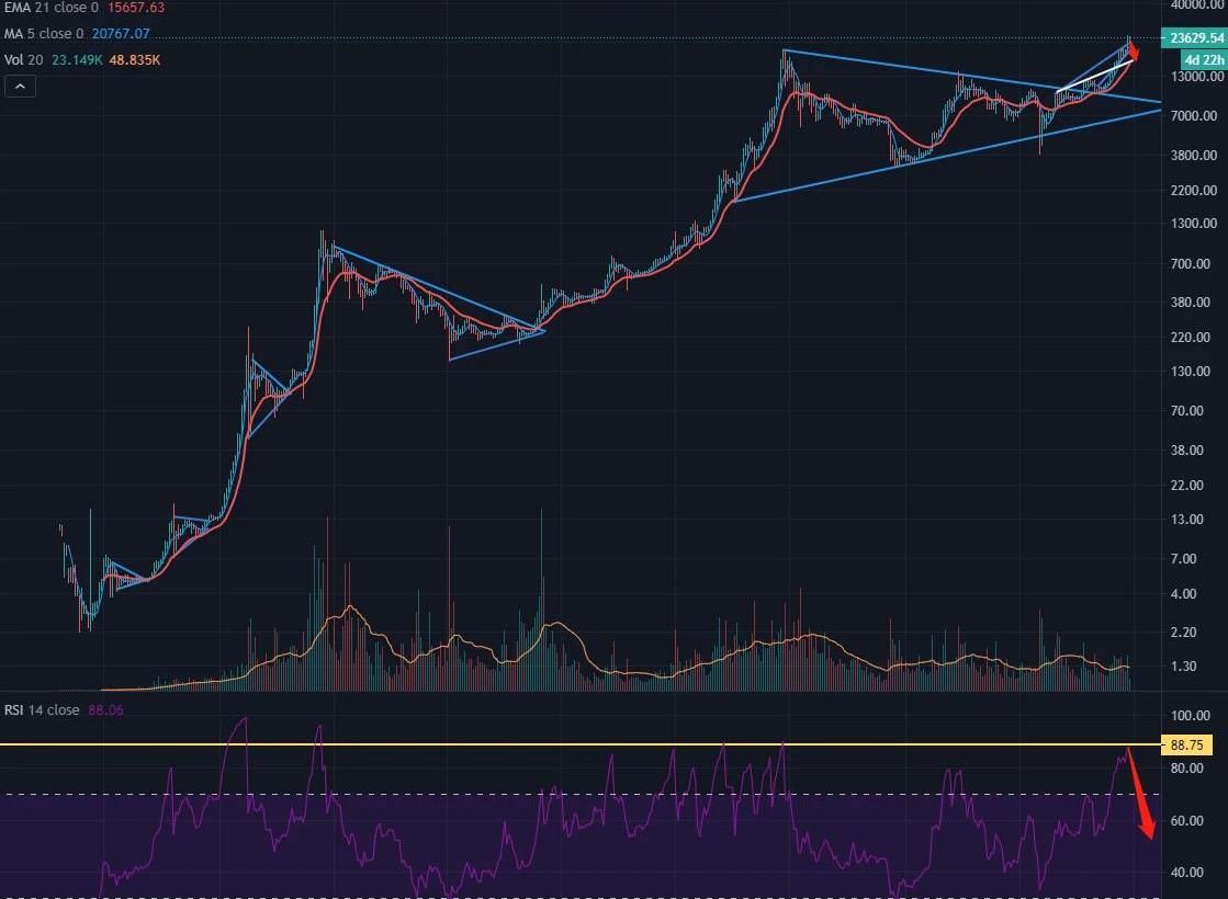 我们注意到比特币周线RSI已经达到88,纵观比特币历史,每当比特币的周线超买情况到达该等级,比特币均进行了较大幅度的快速回调。