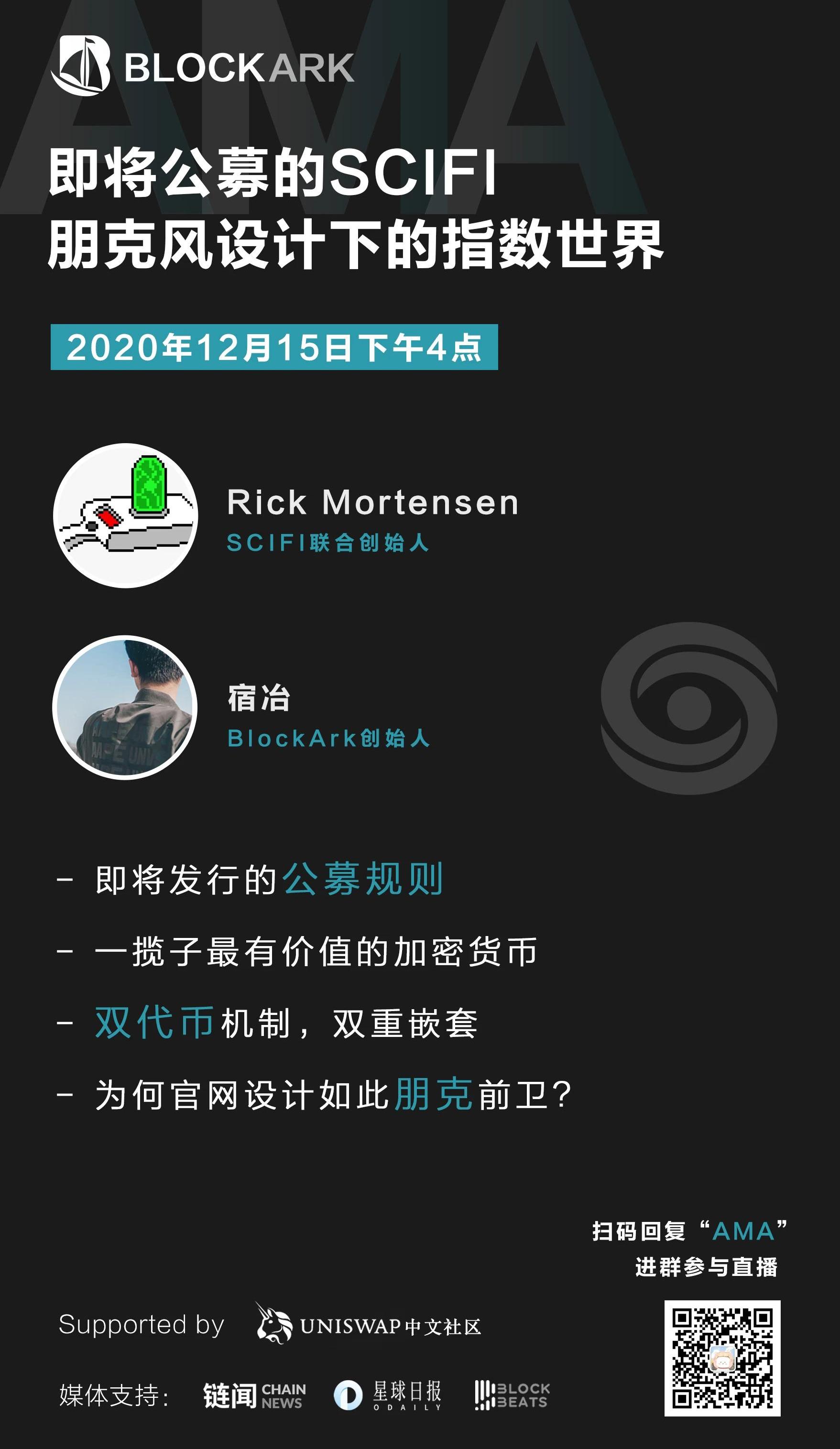 2020年12月15日下午4点,BlockArk创始人宿冶对话SCIFI联合创始人RickMortensen,在Uniswap中文社区进行了“即将公募的SCIFI朋克风设计下的指数世界”的AMA主题活动。本次直播活动由区块方舟BlockArk和BitMax支持,链闻ChainNews、星球日报Odaily、区块律动BlockBeats媒体支持,直播分享内容整理如下: