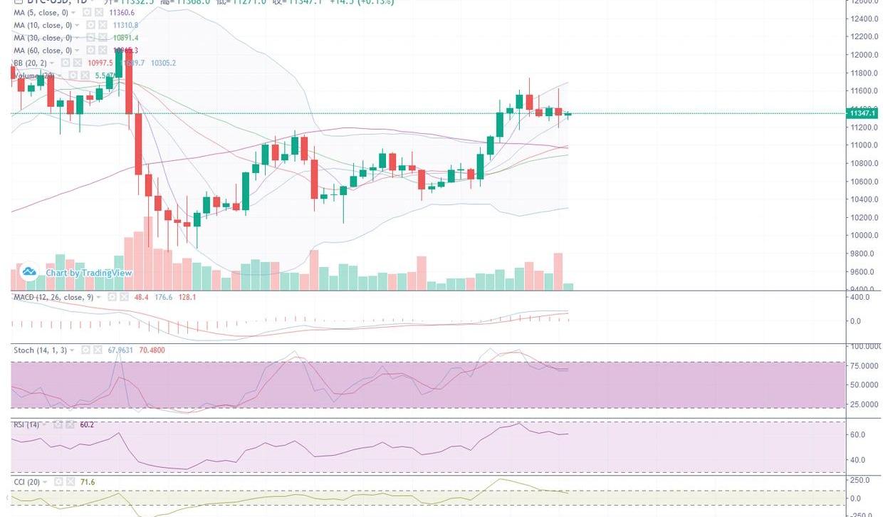日线图上看,日线级别来看,比特币币价连续收阴,布林带依旧保持开口状态,币价开始由上轨回调下跌,震荡运行在其上轨附近,线有向上发散趋势,有形成死叉的趋势,均线指标来看,MA5与MA10形成交叉,RSI指标呈现持续走平现象,MACD上涨动能进一步缩量。周末的行情我们以弱势震荡来看待行情,区间暂时关注11180-11550。