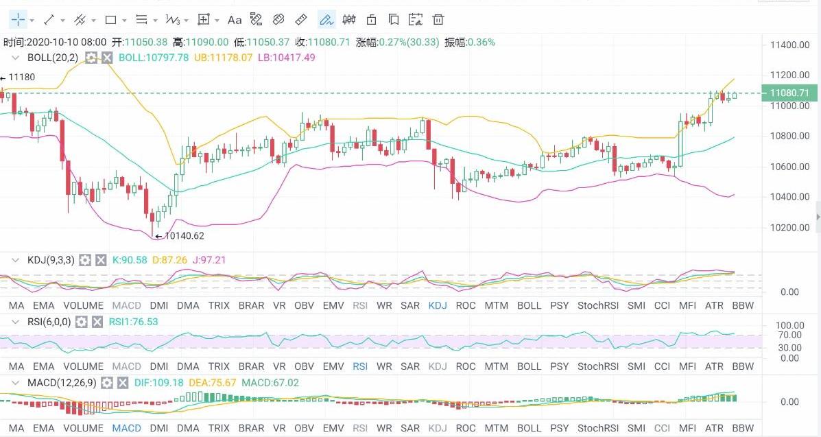 比特币继10月8号的拉升400点之后,于昨日再次起飞,最高触及11100一线附近,目前盘整在11080附近;今天是10月10号,如果比特币将再次起飞,冲击11400币价,那么手持空头的朋友将何去何从?