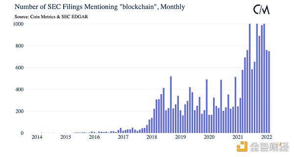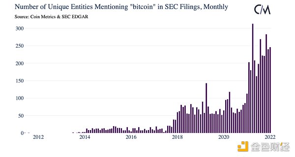 近日链上数据服务商Coin?Metrics通过检索美国SEC数百万文件中提及加密货币相关术语,研究了美国实体接受加密货币的演变趋势。