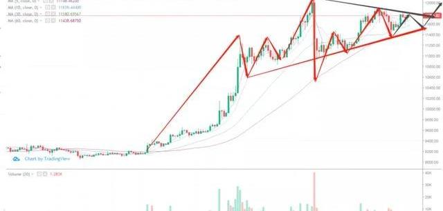 从目前来看,我们做两种分析,一种就是上图的窄幅收窄的三角整理,底部不断抬高,顶部不断降低,市场在缩量的同时,等待方向的确定。另一种分析就是昨天的11100左右的中枢底部回踩,从目前市场的强度来看,这种可能在降低。