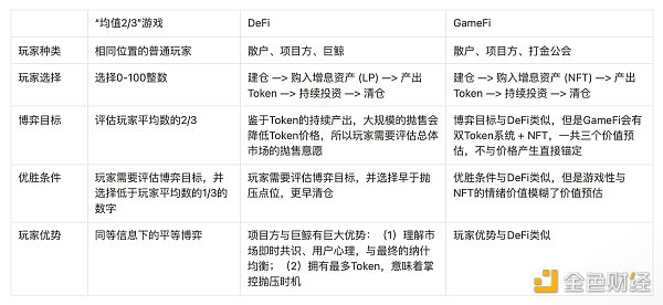 作为金融学领域的经典博弈,“猜均值的2/3”的博弈范式体现在区块链玩家对项目信息的认知、代币价格预期以及未来商业运营的博弈中。在本文的后续章节中,我们会详细解释普通用户、项目方、巨鲸和打金公会等各类玩家在 DeFi 和 GameFi 领域中是如何进行共识博弈的。